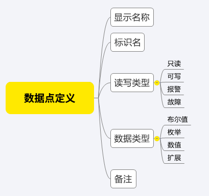 数据点定义基本内容可分为显示名称,标识名,读写类型,数据类型及备注。概图如下: